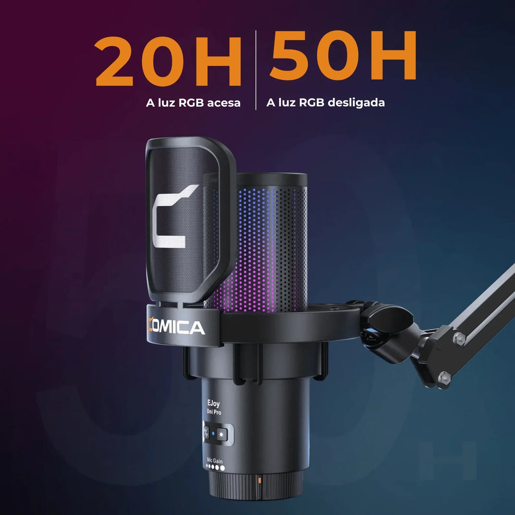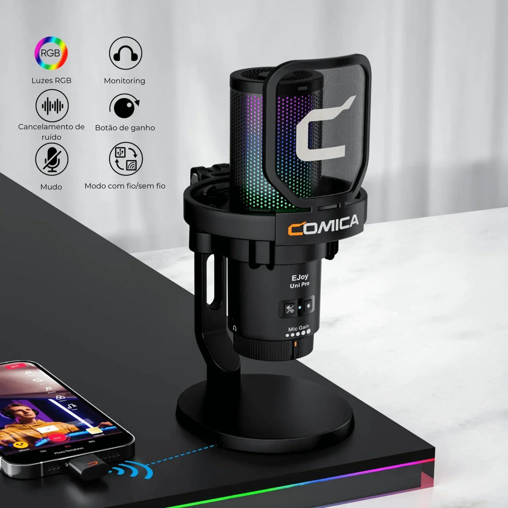 Exclusividade e inovação definem o Comica Uni Pro RGB – Mic Gamer Sem Fio, uma ferramenta essencial para quem busca qualidade sonora sem abrir mão do estilo e da praticidade. Este microfone condensado sem fio com luzes RGB que entrega qualidade de estúdio oferece uma experiência única para streamers, gamers e criadores de conteúdo que almejam o melhor desempenho em áudio.